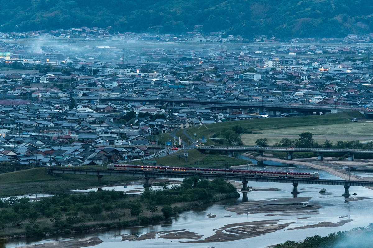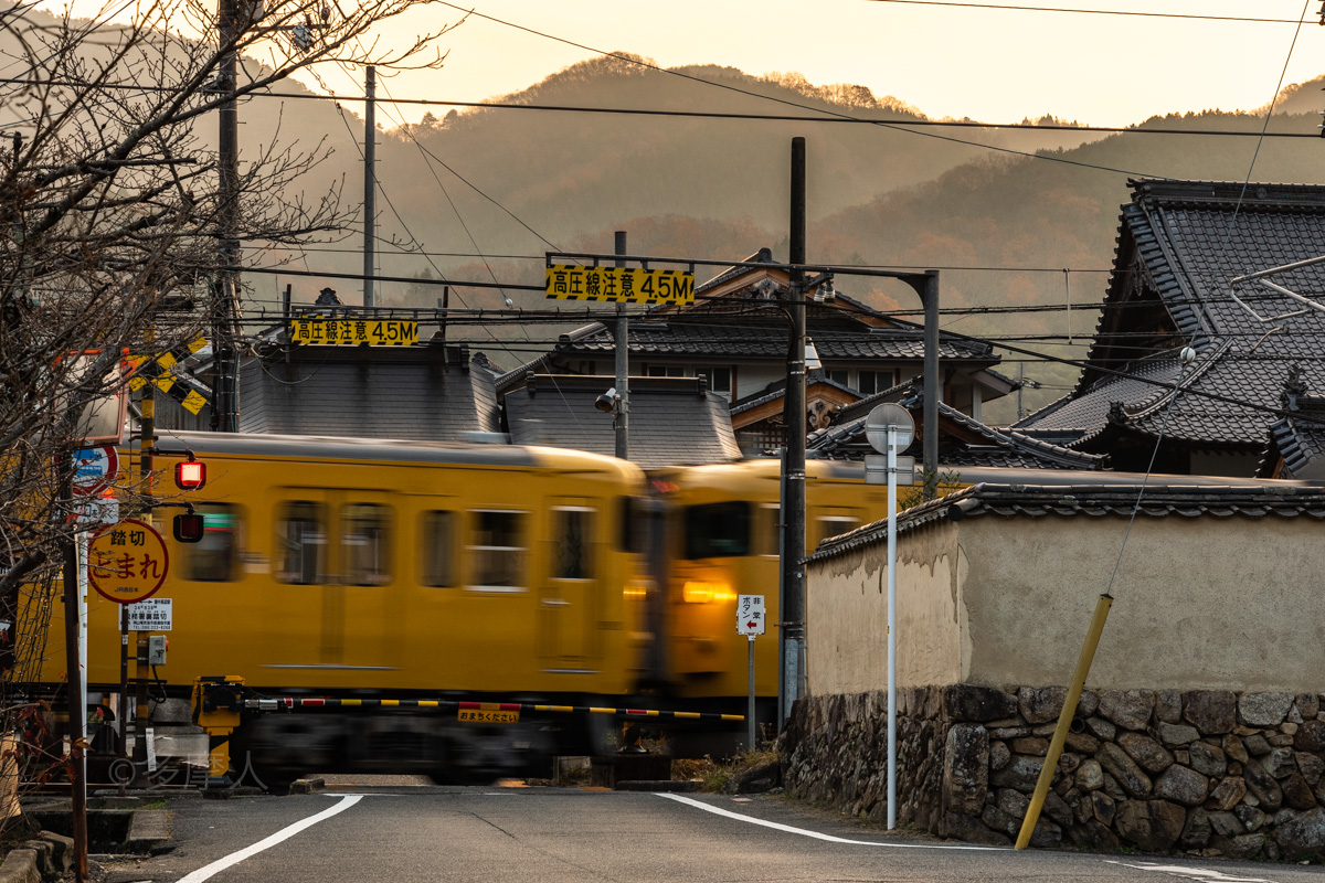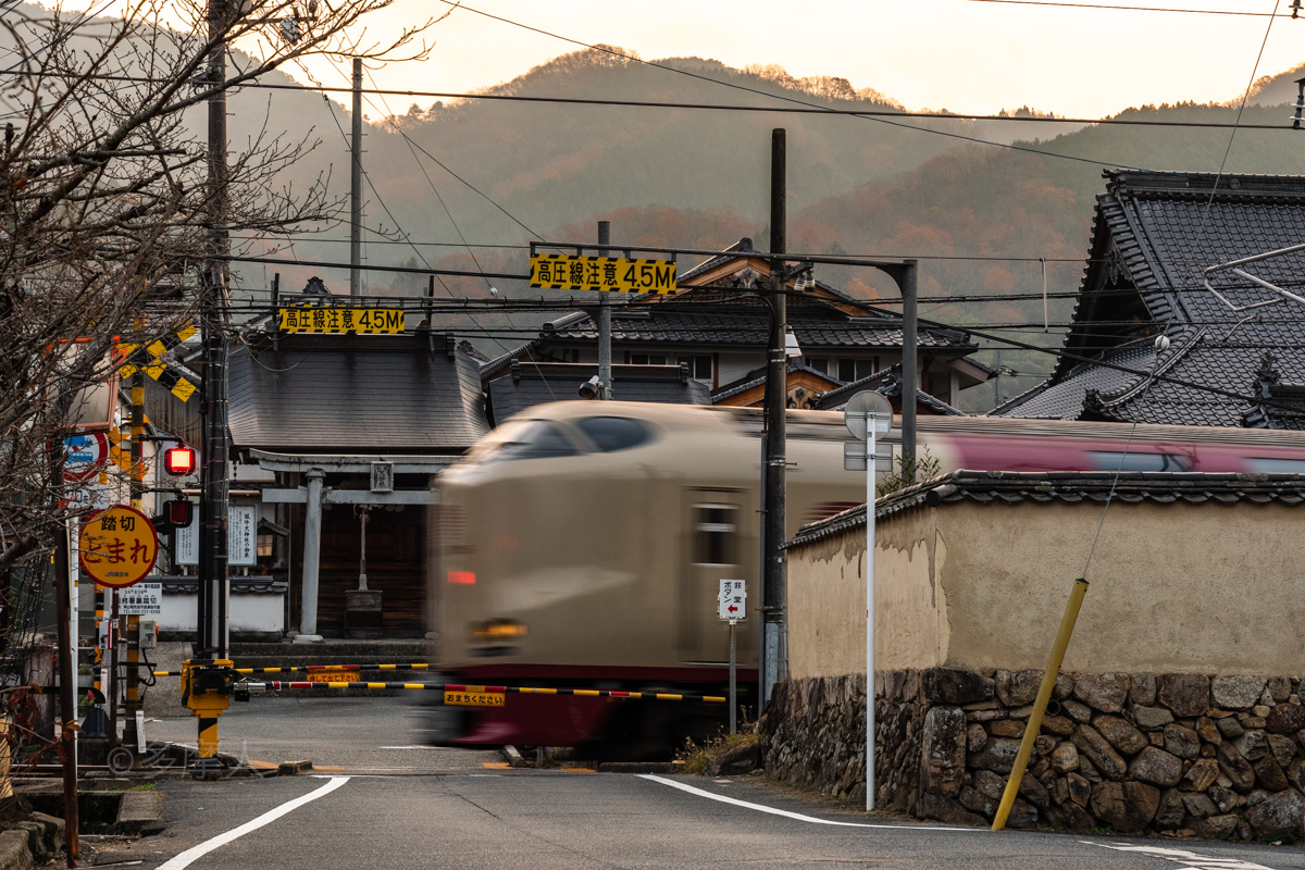 小京都の町並みを横切るサンライズ。