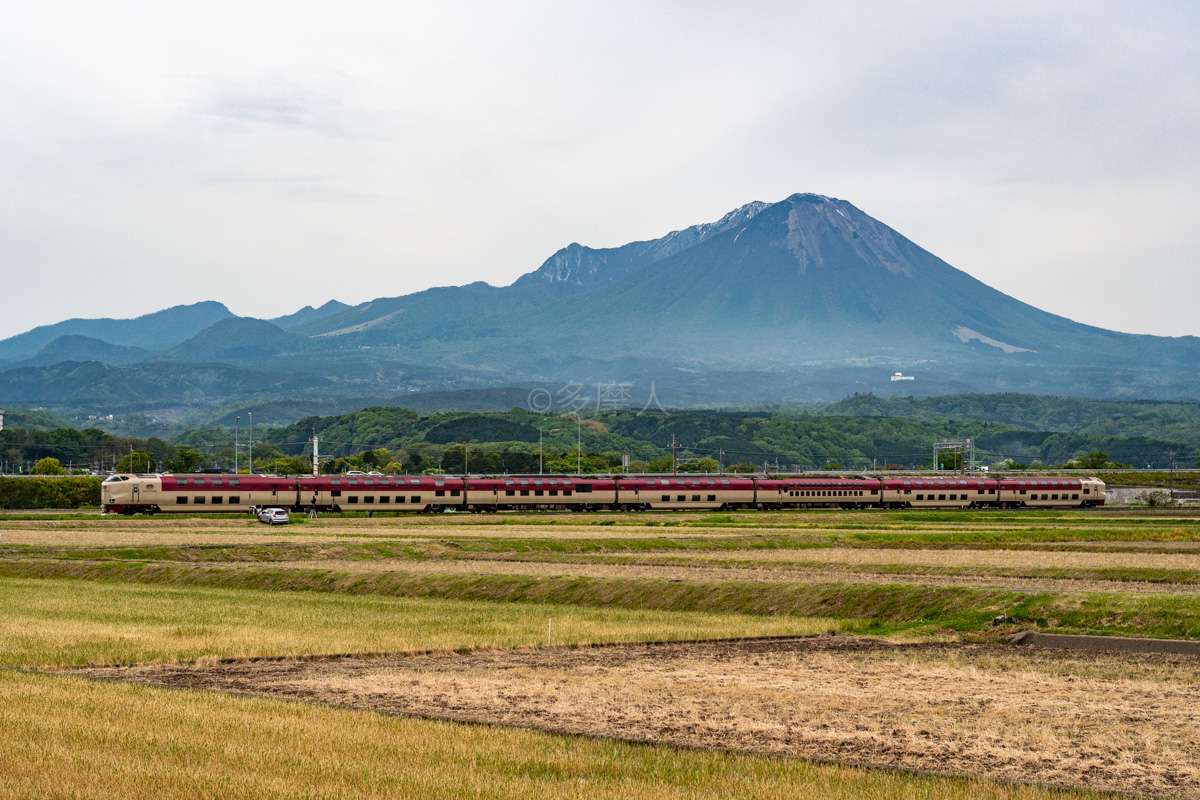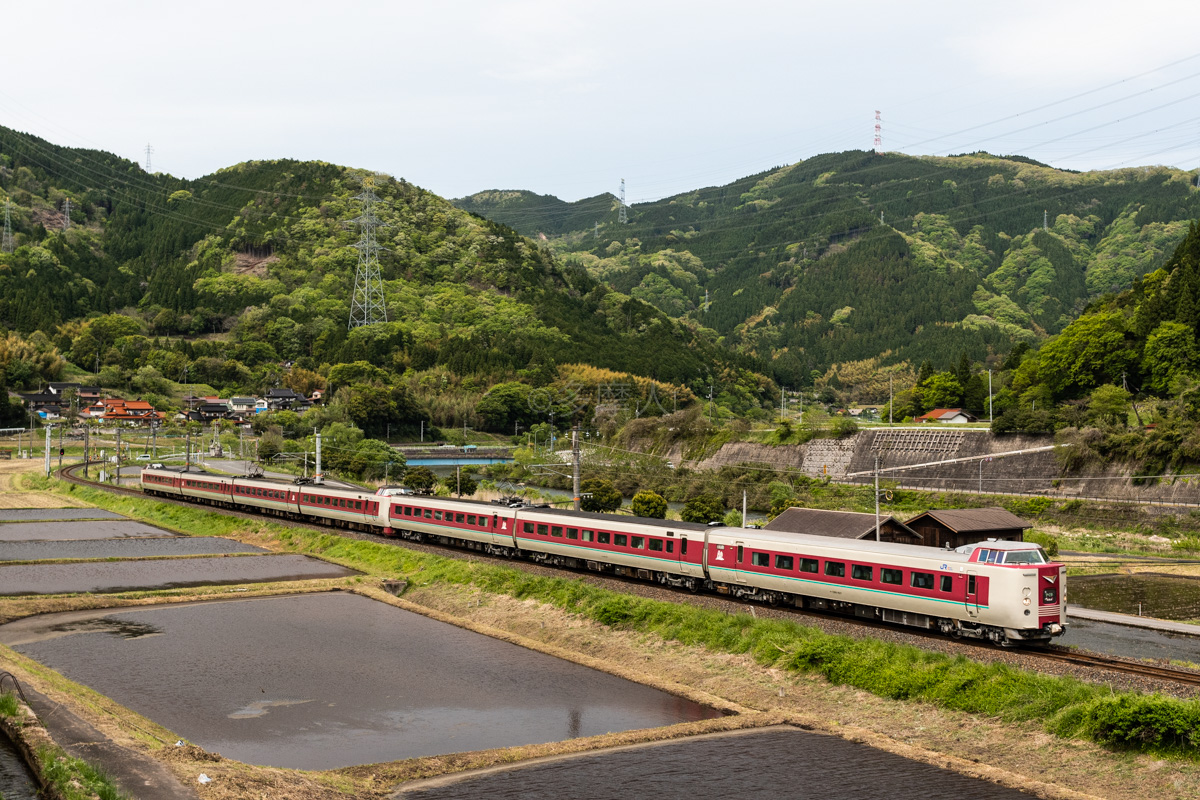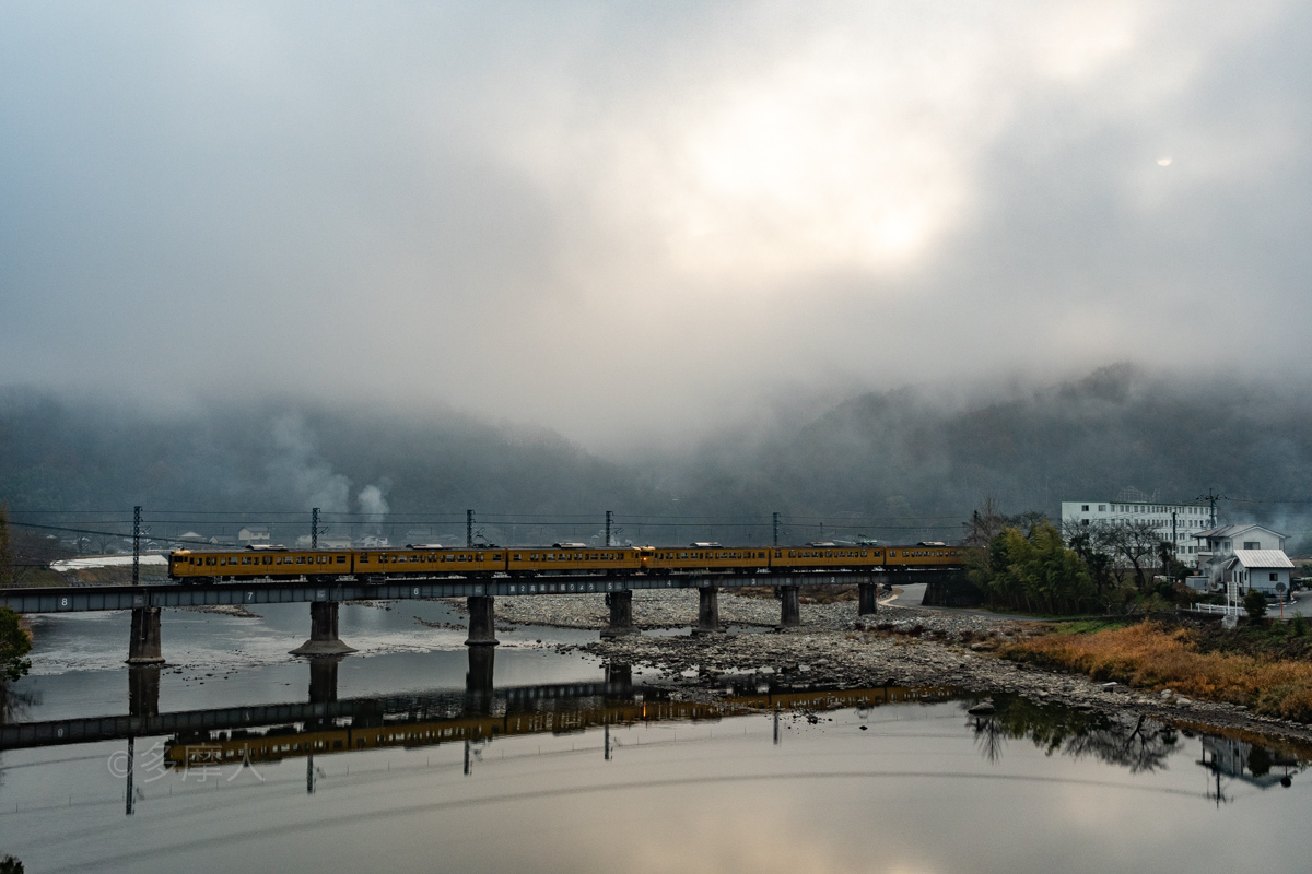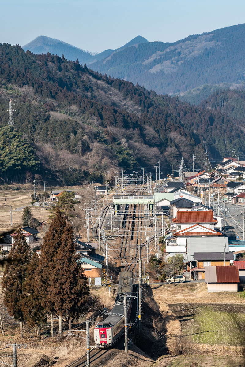 小京都の町並みを横切るサンライズ。
