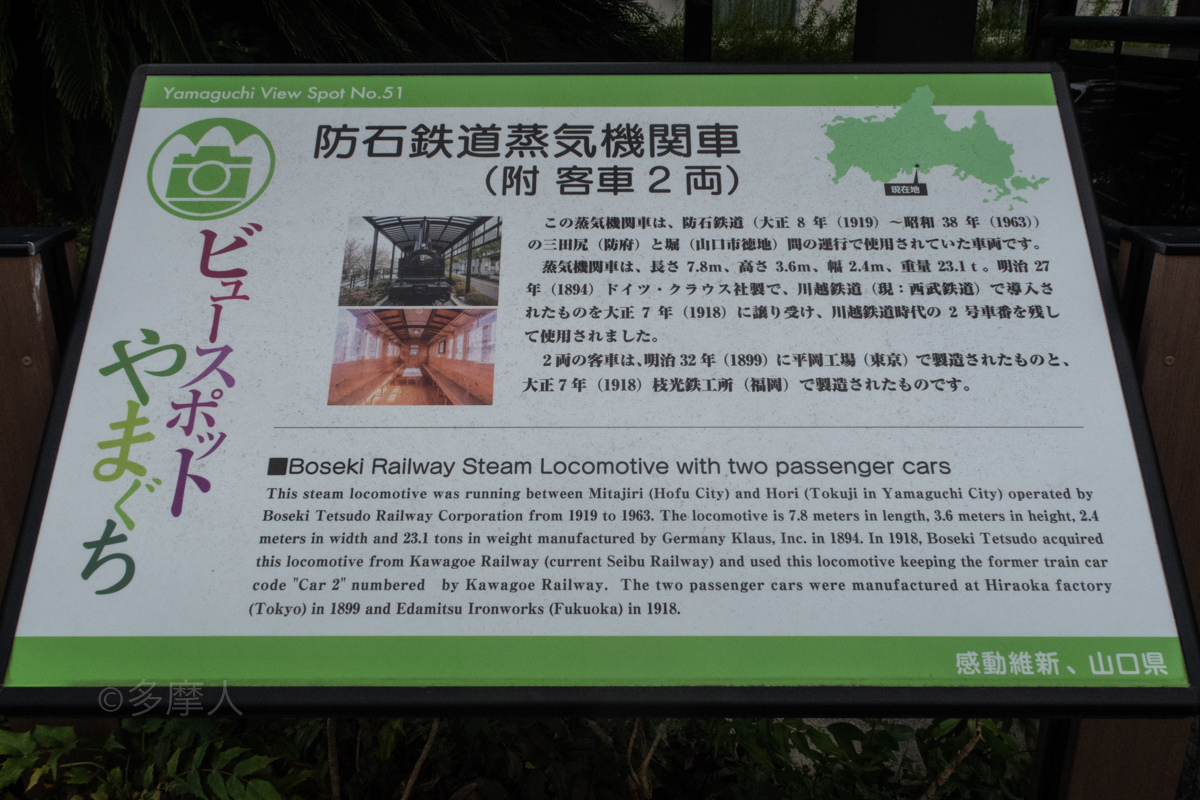 防府駅前で静態保存されているのはドイツ・クラウス社製の蒸気機関車と客車2両。