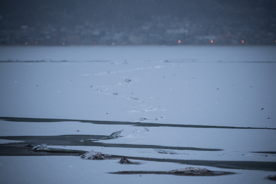 雪が積もると結氷が一目瞭然の上,御神渡りの亀裂もくっきり.