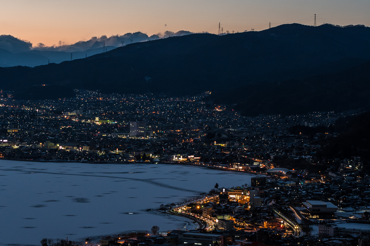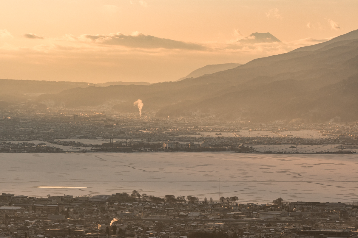 諏訪湖はほんの一部しか映らない画角ですが,丁度良い位置に御神渡り.