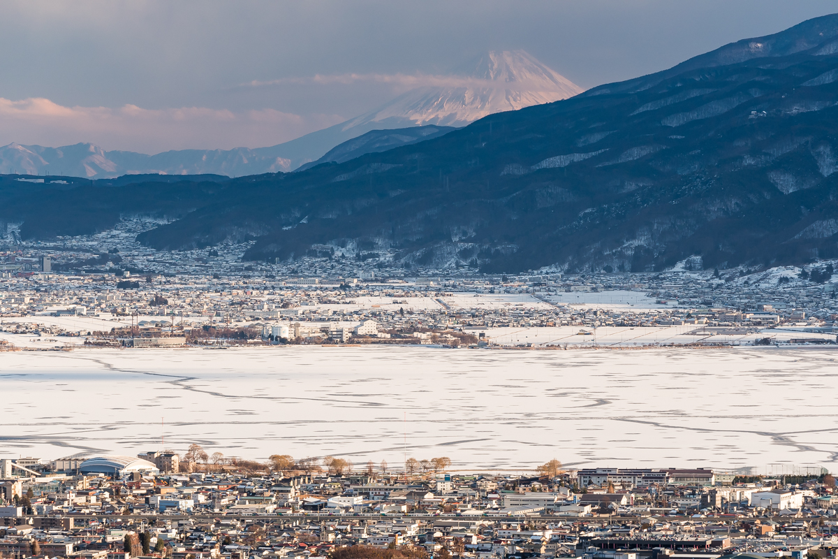 ほぼ逆光ながら富士,諏訪湖の御神渡り,あずさ.